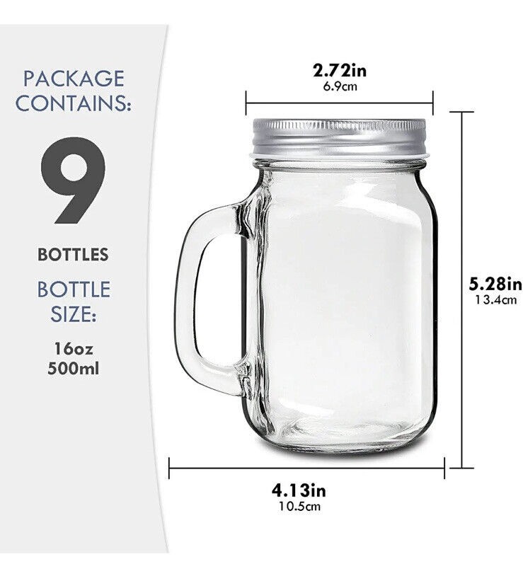 9 Pack 16 Oz Mason jar Drinking Glasses, Mason Mugs with Handle, Old Fashioned R