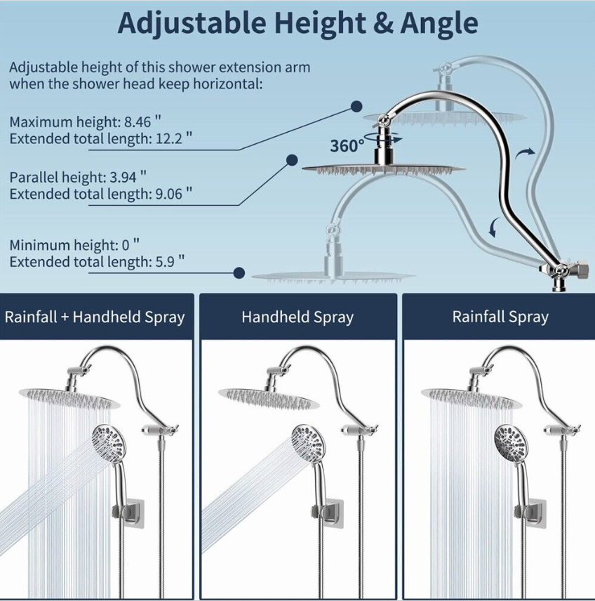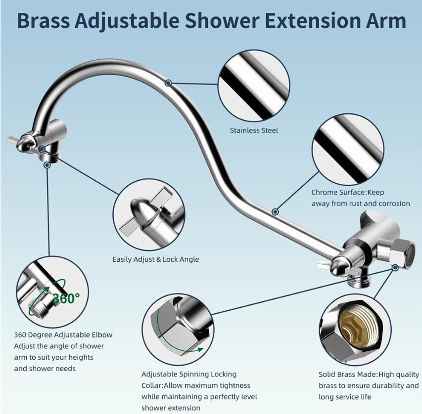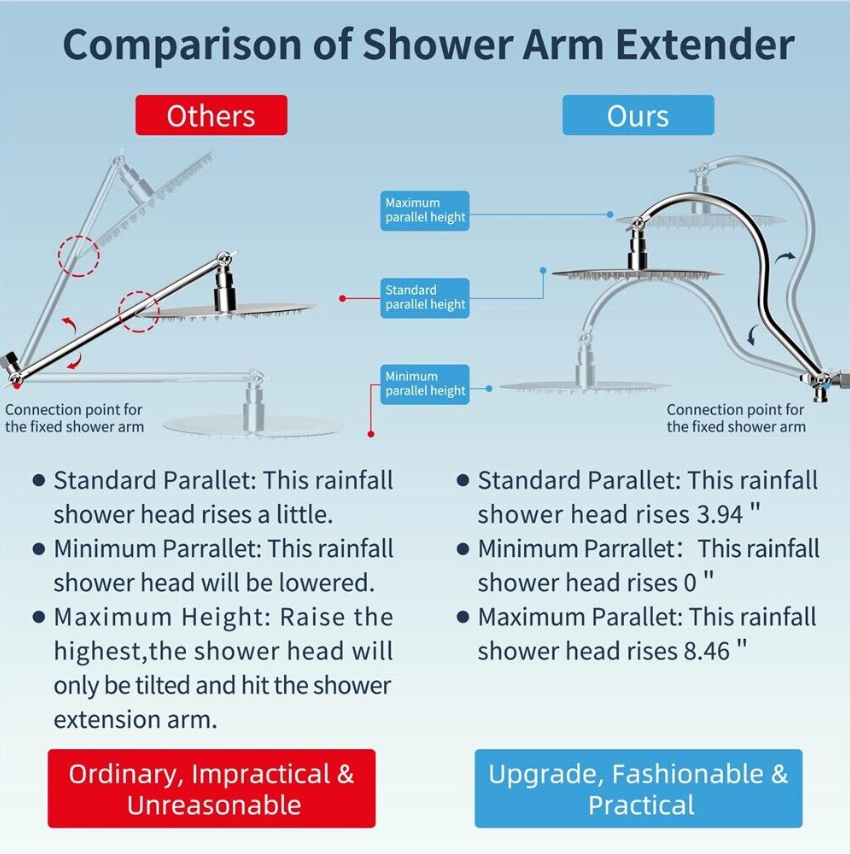 12'' Upgrade Adjustable Shower Extension Arm: Height & angle adjustable curved shower head arm extension fits any rain shower head or handheld shower head, height can be adjusted up and down, shower head is always vertical in your large size and will not hit the shower arm, instead of sloping water like ordinary straight shower arms. Curved shape design enhances its bearing capacity, high rise your shower head, and can achieve vertical water.