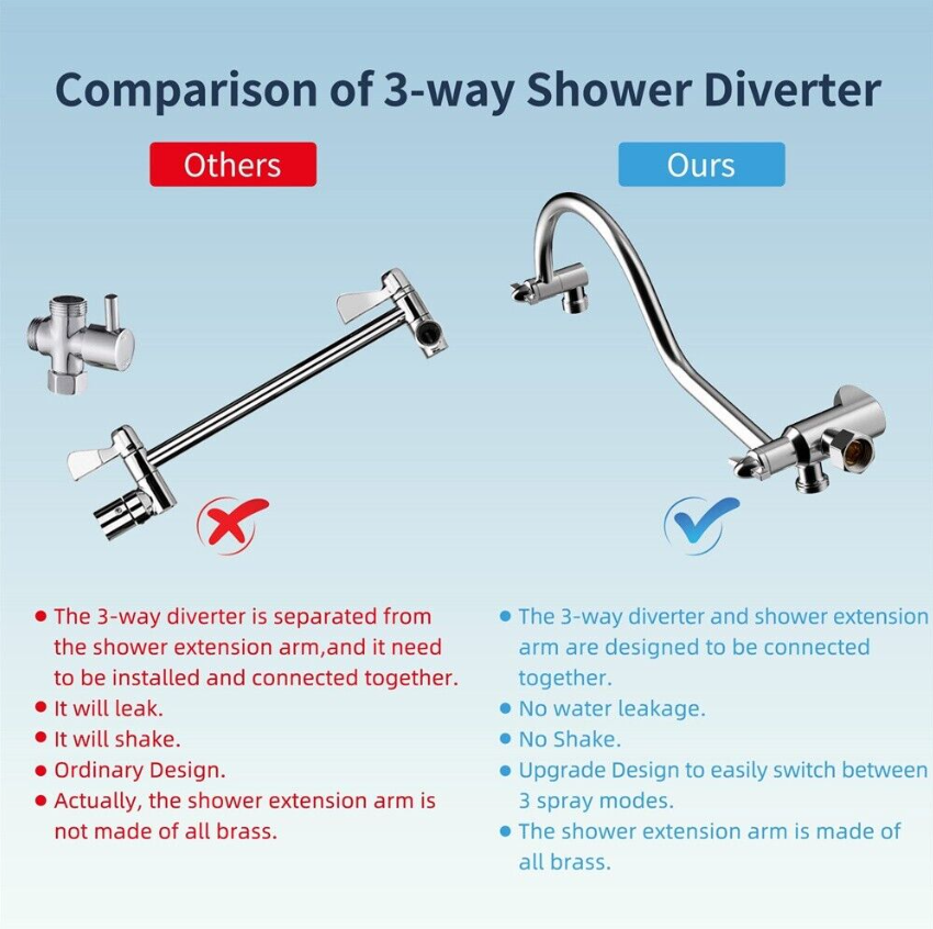 Upgraded 3-Way Diverter Valve: This shower head combo is very easy to install without tools or plumbers. The 3-way diverter can be used with a shower head/rainfall shower head alone, or with two showers at the same time. Our 3-way diverter and shower extension arm are designed to be connected together without leaking and shaking, while ordinary 3-way diverter is separated from extension arm, and it needs to be installed and connected together,which will lead to leak and shake.
