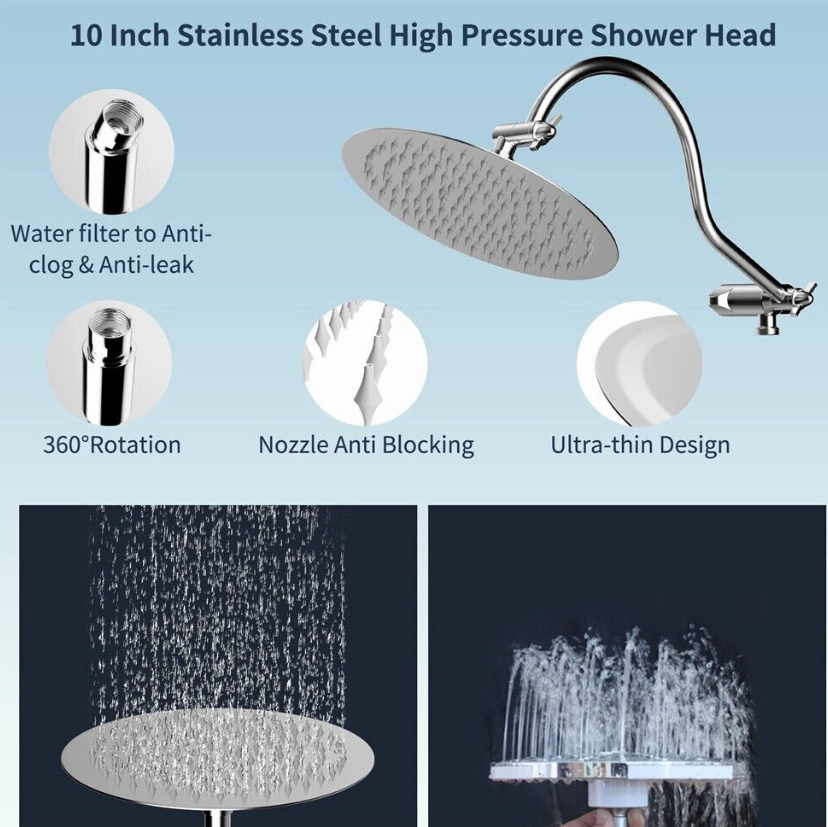 10'' Rainfall Shower Head: The large rainfall all metal round shower head body is made of certificated SUS 304 stainless steel to ensure rust resistance, durability, and long service life. Combined ultra-thin design with air-in technology, the large shower head has 126 splash jets that delivering a rain spray. The brass swivel ball connector adjust the shower head to any angle you want to enjoy a relaxing hotel-style bathing experience.