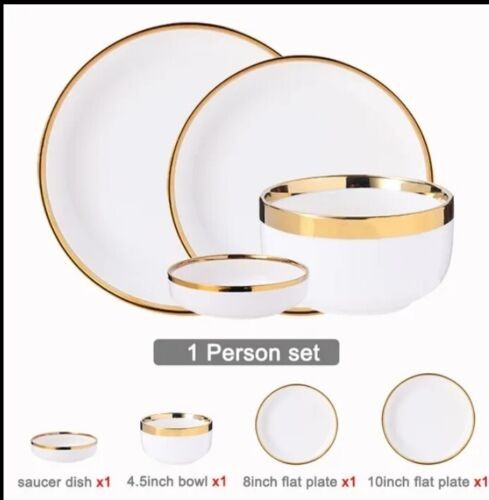 Ceramic Tableware Dinner Set Round White Color With Gold Rim Plates For 1 Person