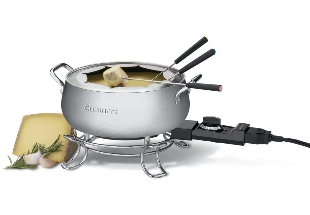 This 3-quart capacity 1000-watt electric fondue set is suitable for chocolate, cheese, broth and or oil