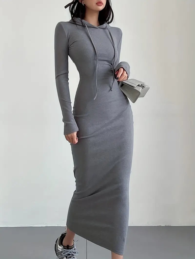 Drawstring Hooded Dress, Casual Long Sleeve Bodycon Dress, Women's Clothing