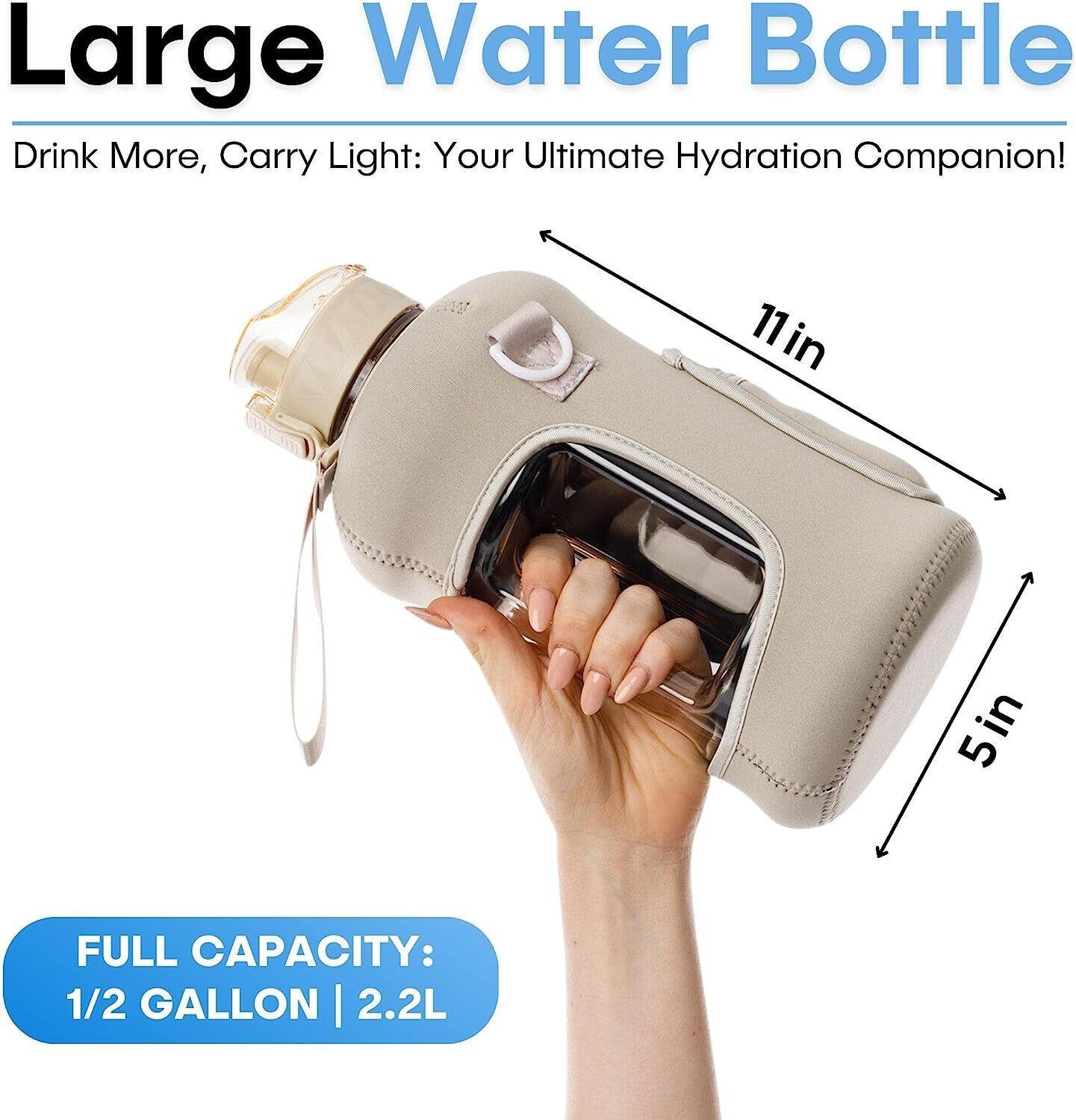 Half Gallon Water Bottle with Storage Sleeve and Straw Lid - 2.2 Liter Large Wat