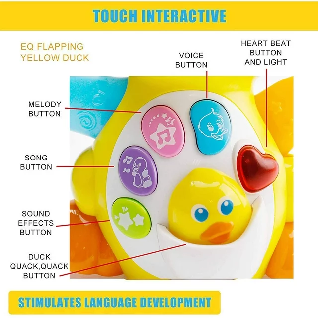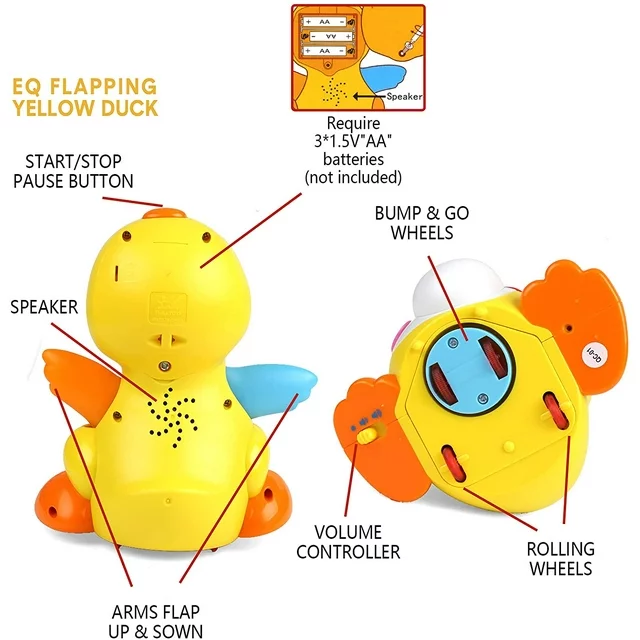 • ??CUTE MOVEMENTS - Bump and Go Action, Wings flap and light up when music begins, Lights, Music, and Talks (Adjustable Volume), Buttons on duck imitate duck sound and sing a tune when pushed.