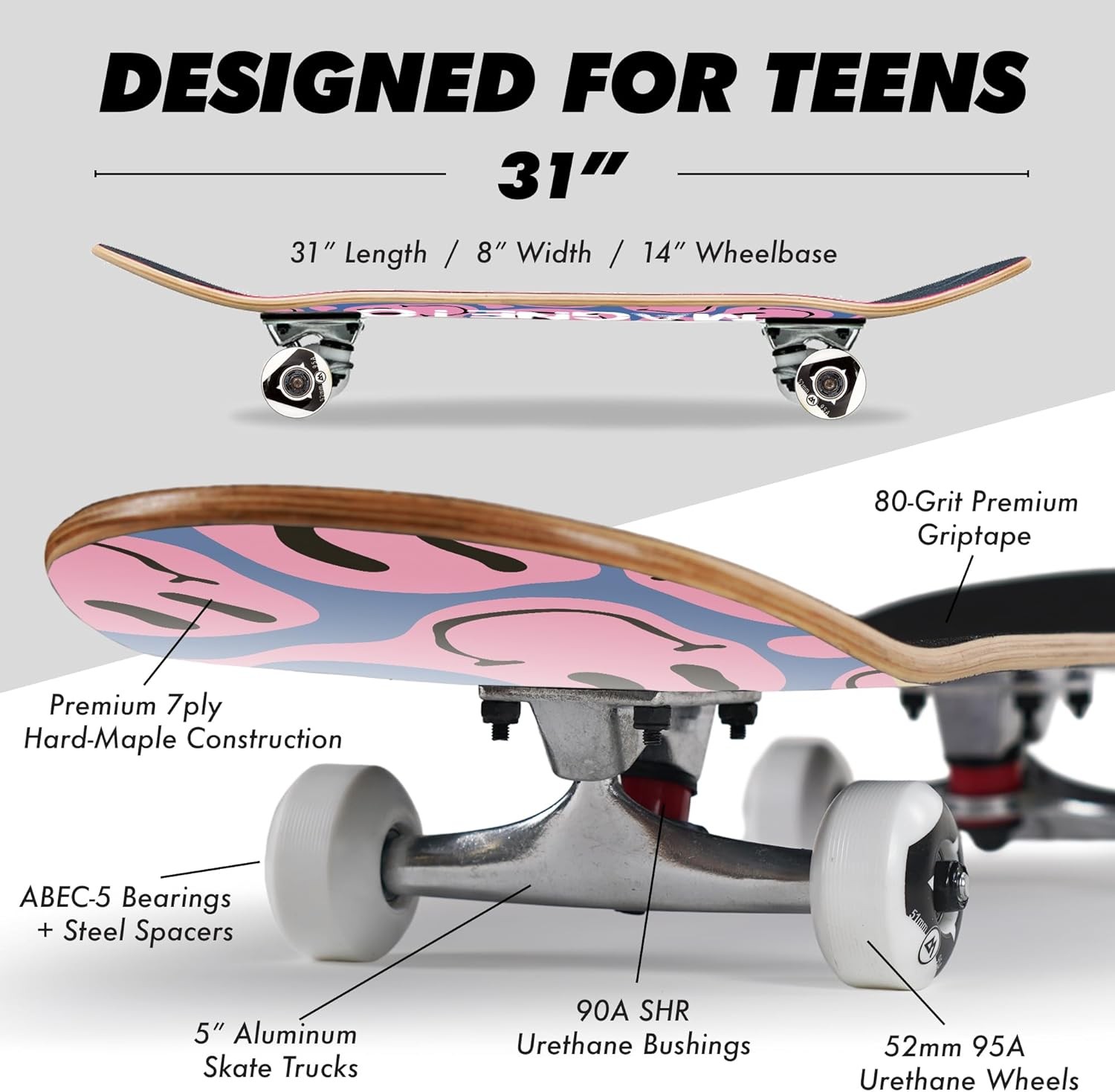 Start riding like a pro with aluminum trucks, SHR urethane wheels and long-lasting abec-5 bearings.