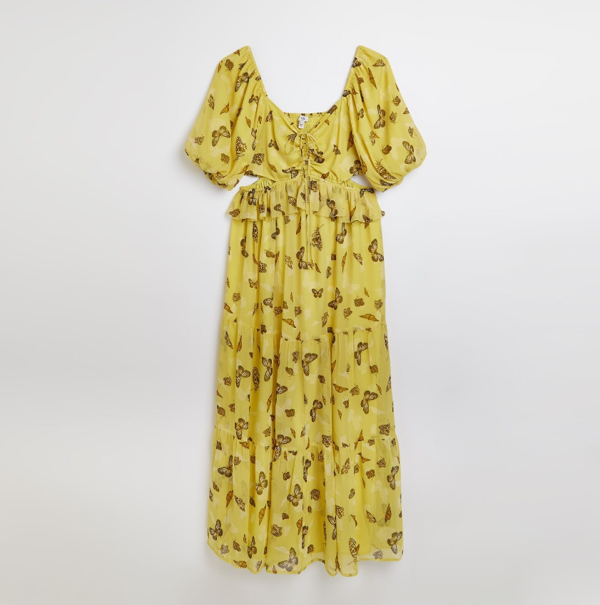 River Island Womens Maxi Dress Yellow Print Cut Out Stylish Short Sleeves