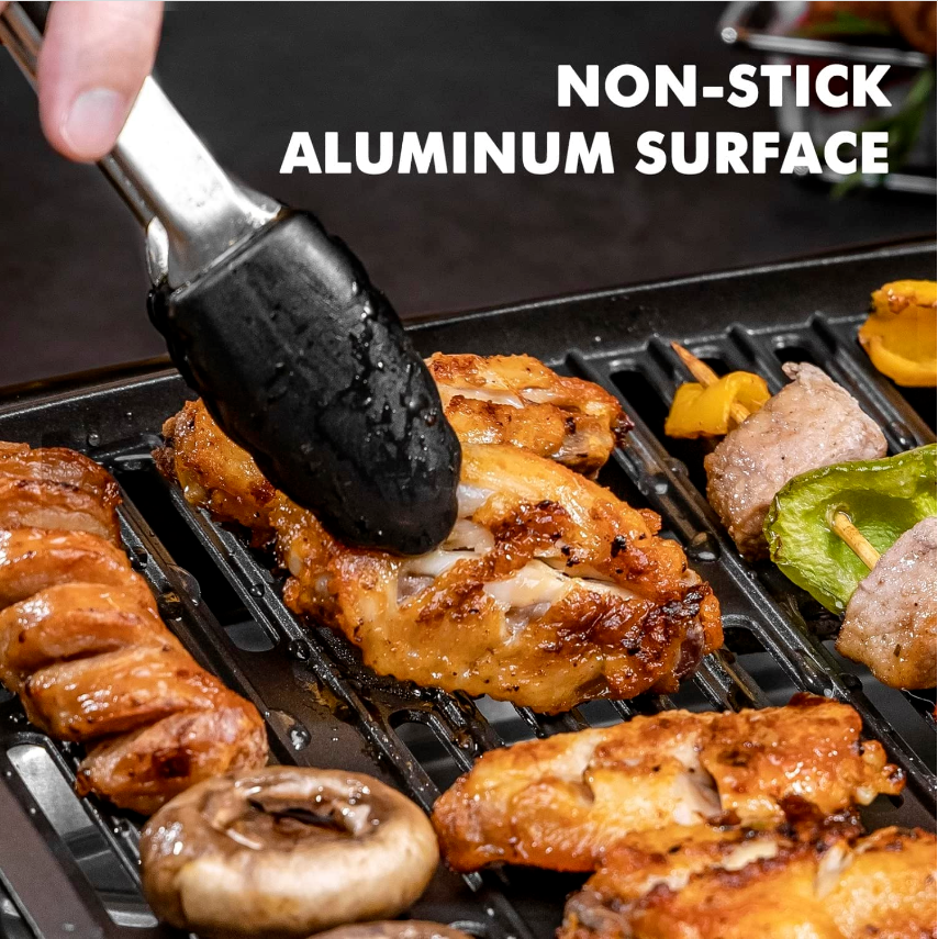 • : The cooking plate measures 16" x 10", allows multiple ingredients to be cooked at the same time, such as steak, chicken leg, kebab, vegetables and more. Nonstick surface make you cook with little oil without leaving burnt-on residue, easy to take the food. Deoiling design makes less calories and offers a health diet.