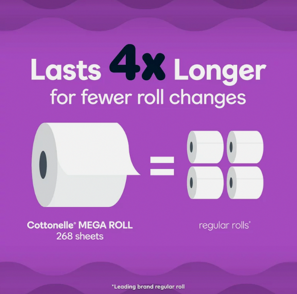 • Ultra Comfort Toilet Paper, 24 Mega Rolls; 268 sheets per roll lasts 4x longer* for fewer roll changes